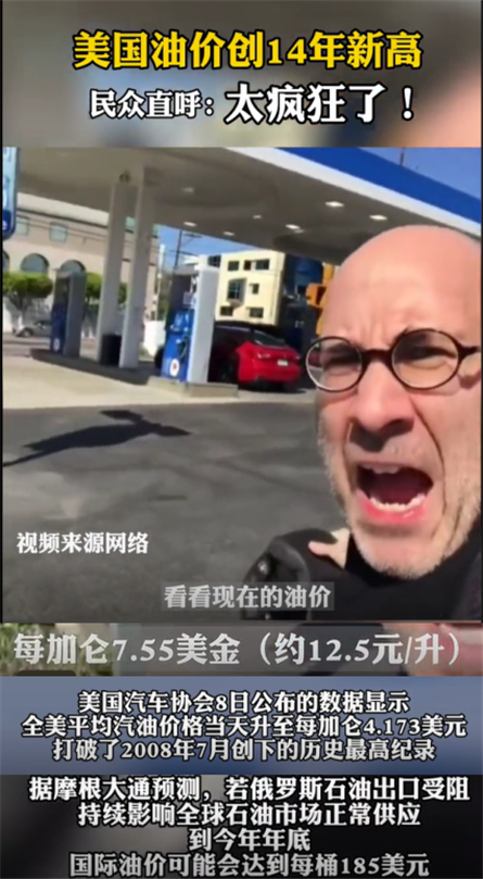 欧美不让俄罗斯卖,俄罗斯也不求着你们买。然后,全球油价就开始暴涨了,短短半个月涨了30%之多。美国是油气出口大国,自己不缺石油和天然气,但对居民的零售价是按照国际市场价格来定的,商家绝对不会亏本卖货。每升汽油涨到了12.5元人民币,看看美国老百姓那幸福的笑容,多开心。