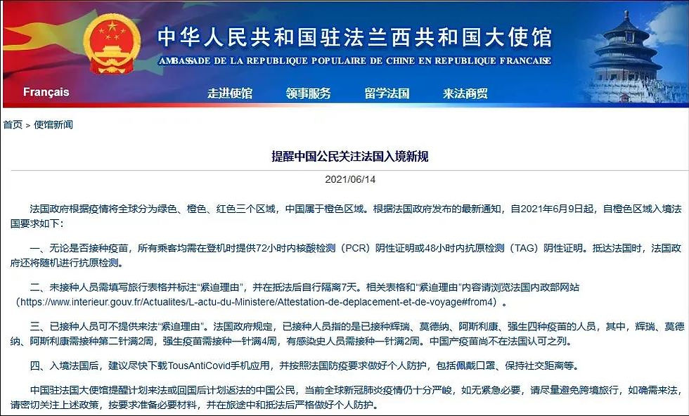 中国驻法国大使馆提醒计划来法或回国后计划返法的中国公民,当前全球新冠肺炎疫情仍十分严峻,如无紧急必要,请尽量避免跨境旅行,如确需来法,请密切关注上述政策,按要求准备必要材料,并在旅途中和抵法后严格做好个人防护。