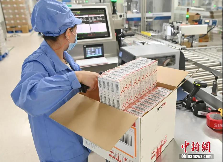 (图为北京时间6月1日,位于北京市大兴区的北京科兴中维生物技术有限公司内,工人在新冠灭活疫苗包装生产线上进行开箱登记扫描作业。中新社记者 侯宇 摄)