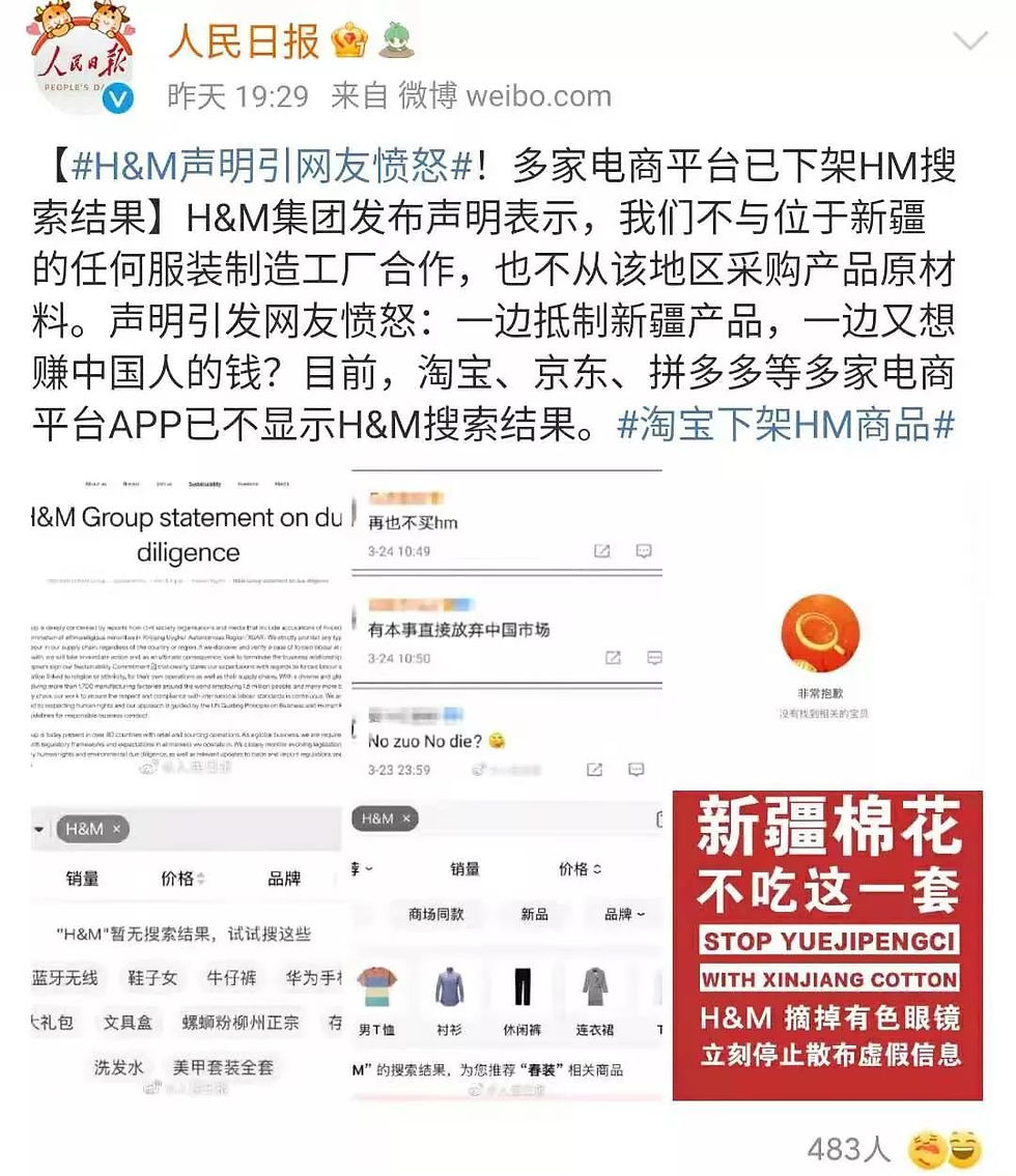 H&M的声明发出后,人民日报等官方微博发布了多条微博声讨H&M集团的不当行为。