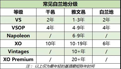 根据熟成时间的不同,白兰地可以划分为不同的等级。以下是最常见的干邑和雅文邑的陈酿年限最低标准。