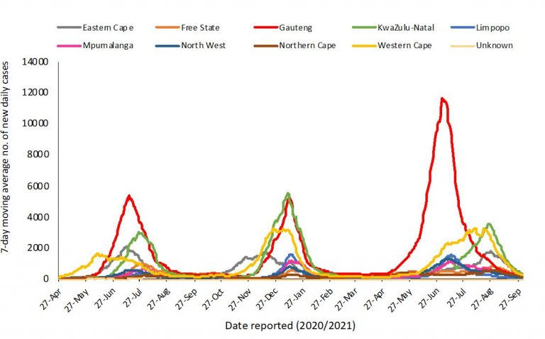 豪登省新增152例, 西开普省新增141例, 东开普省新增95例,夸祖鲁-纳塔尔新增167例.