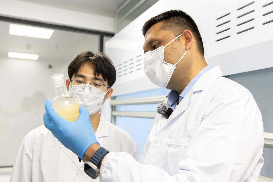 Muhammad Shahbaz (R) makes an experiment with a colleague at the neutron science institute (Chongqing) of the FDS consortium in southwest China's Chongqing Municipality, July 29, 2025. (Xinhua/Huang Wei)