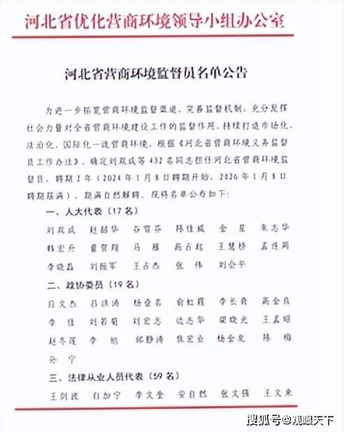 (本网讯)近日,在河北安平县的河北省丝网产业协会获悉,河北省优化营商环境领导小组办公室发布《河北省营商环境监督员名单公告》,河北省丝网产业协会会长梁畔逢受聘。为进一步拓宽营商环境监督渠道,完善监督机制,充分发挥社会力量对全省营商环境建设工作的监督作用,持续打造市场化、法治化、国际化一流营商环境,根据《河北省营商环境义务监督员工作办法》,确定刘双成等432名同志担任河北省营商环境监督员,聘期2年(2024年1月8日聘期开始,2026年1月8日聘期届满),期满自然解聘。转自搜狐网